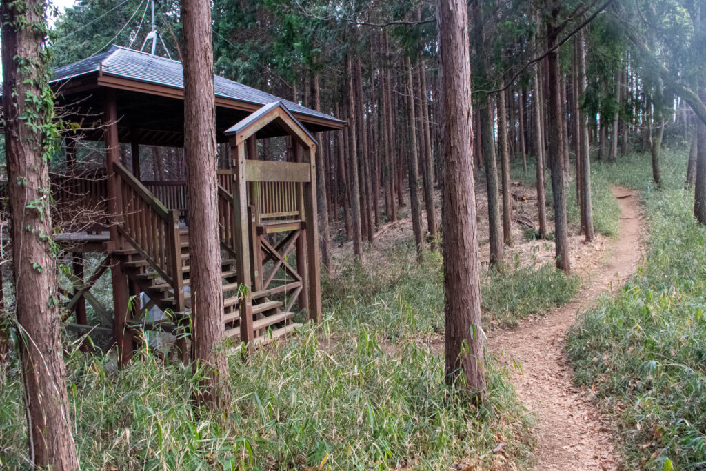 坂道を登り続けて少し斜度が緩やかになってくると木製の展望台らしきものが見えてきます。