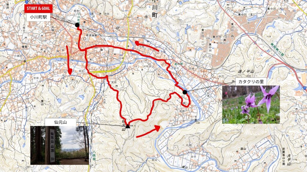 なお、今回は小川町駅から仙元山を経由してカタクリとニリンソウの里へと向かう最短ルートを歩いた場合を紹介しています。