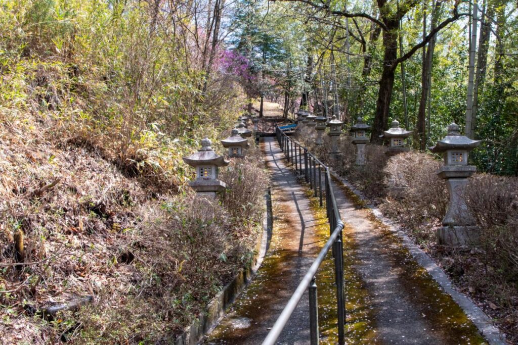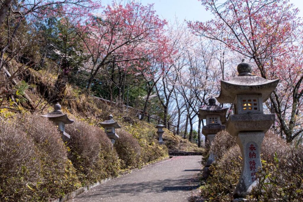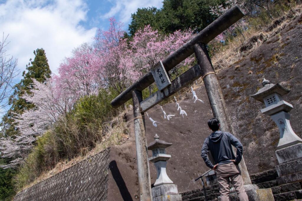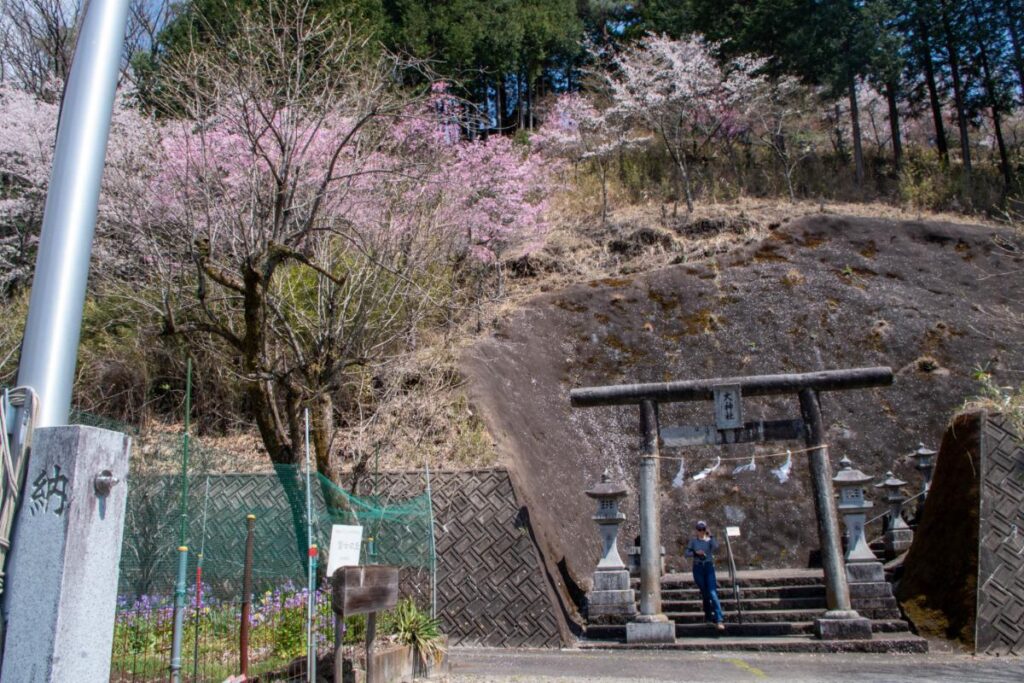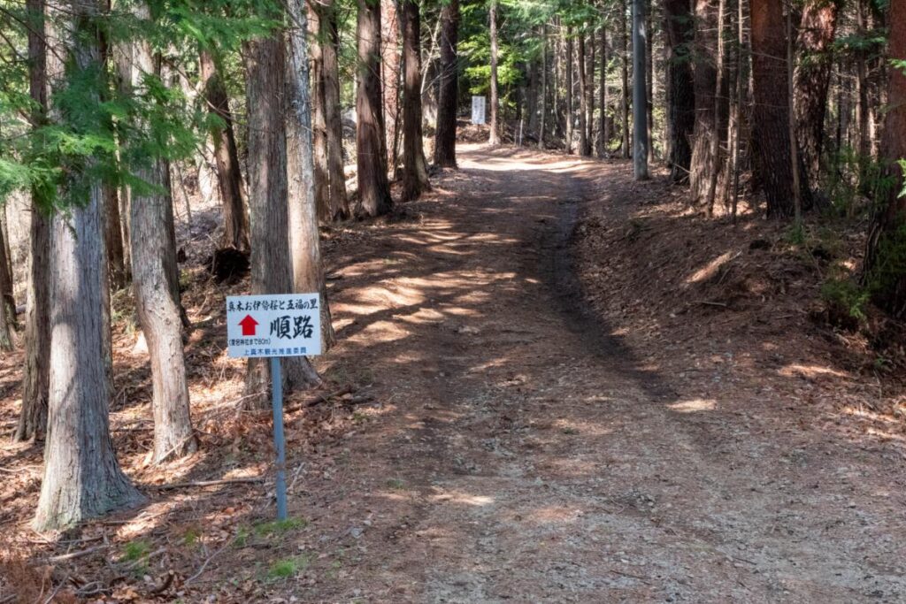 さて、そういうわけで桜の群生地へと向かうのですが、大神社から登った際の分岐点を右手(公衆トイレのある方)に進んでいきましょう。