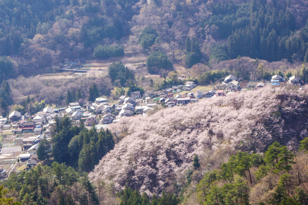 山肌を埋め尽くすように桜が群れており、見渡す限り淡い色で埋め尽くされたように錯覚するほど