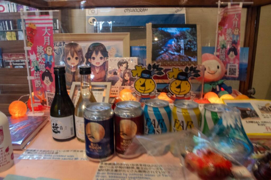 そして、最後にもう一か所。大月駅内の待合室の展示スペースには大人気の山岳漫画であるヤマノススメと特産品の紹介がなされています。
