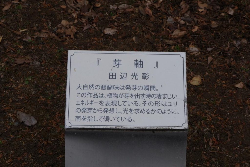 ④『芽輪』は天神峠を越えて藤野駅方面と下っていく峠道に展示されている作品です。発芽のエネルギーを表した作品とのことで、数ある芸術作品の中でもこの作品が一番腑に落ちたものでした。