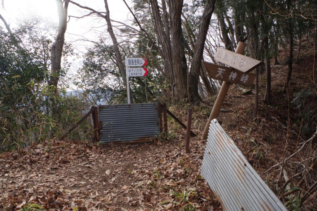 完全に名前負けしている見晴し台からもう少々進んでいくと車道と合流します。こちらが天神峠というポイントです。