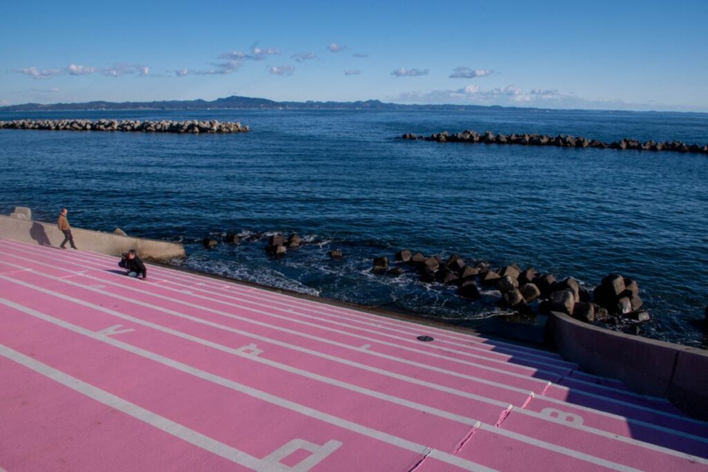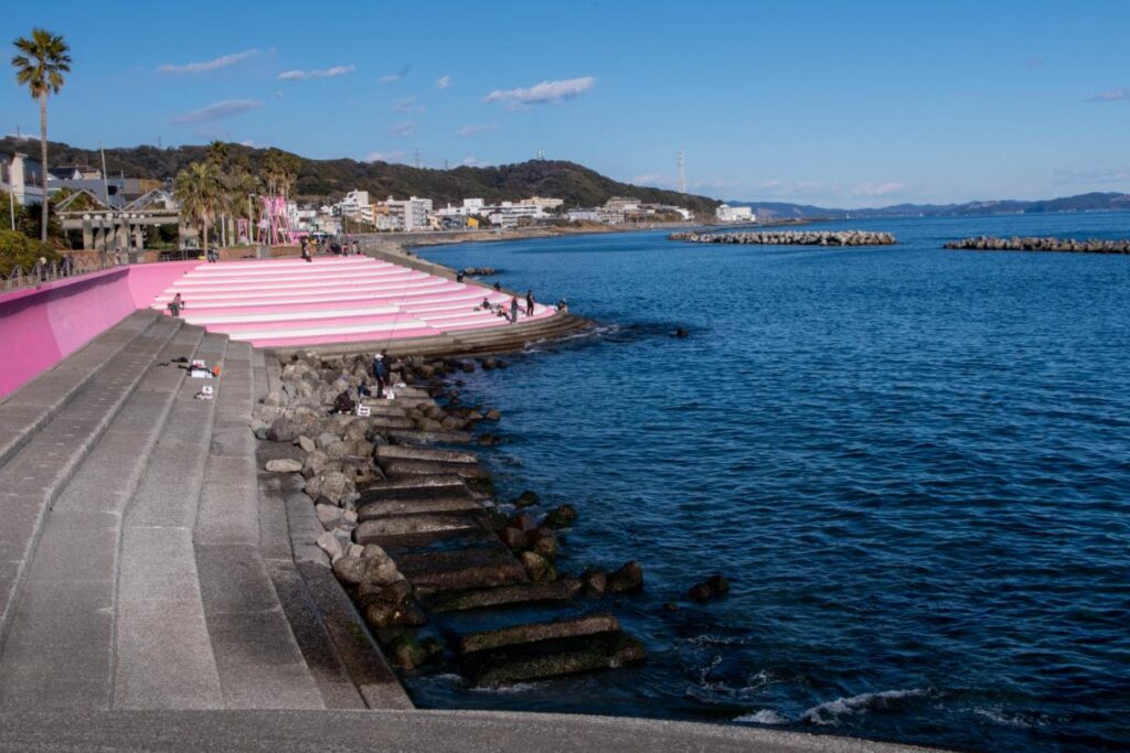 どうしても目についてしまうのが、野比海岸に至る所にペインティングされた明るいピンクと白色のオブジェたち。