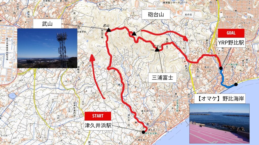 なお、私が歩いた際は、少しアレンジを加えており『どうしても野比海岸のスイセンロードを歩いてみたい!』という事情もあり、津久井浜駅➡(三山縦走)➡YRP野比駅へ下山するルートを採用しました。