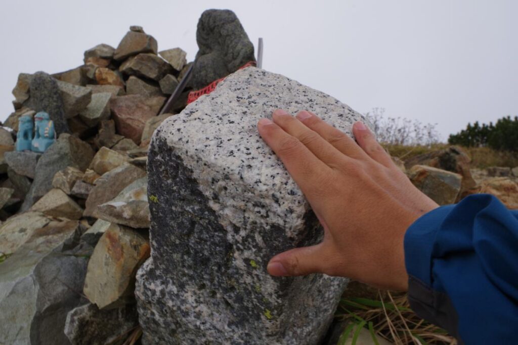 悔しい山頂とはなりましたが、儀式としてきちんと三角点にも優しくタッチをしておきます。