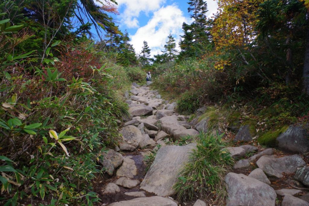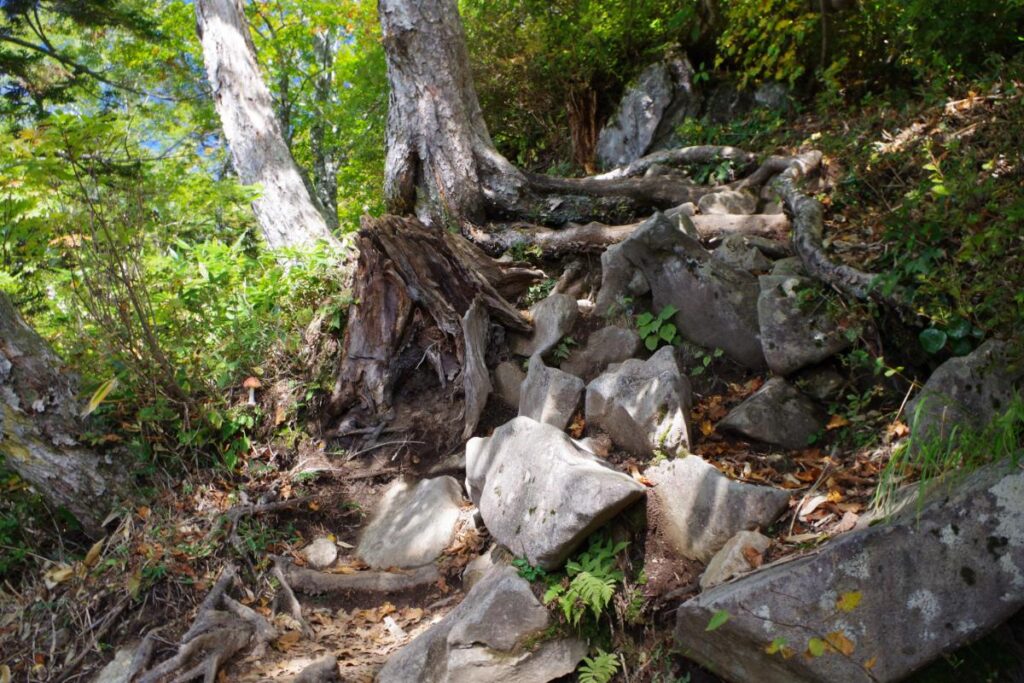 前半の歩きやすかった登山道とは違い、むき出しのゴツゴツとした岩場が行く手を遮ります。
