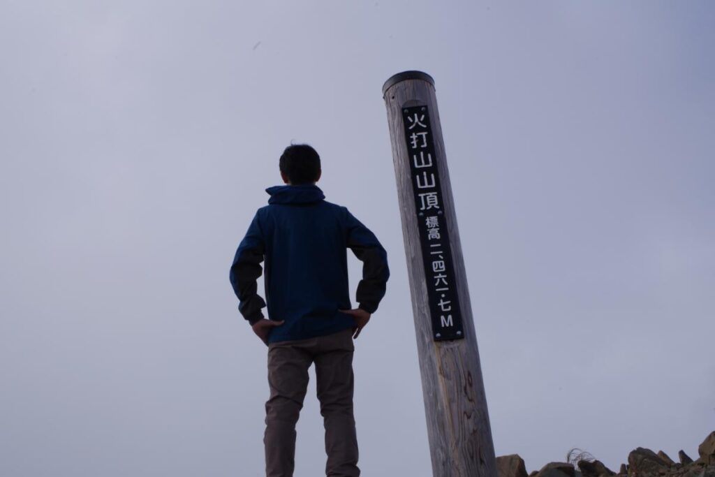 さて、そういうわけで火打山の山頂に到着です。標高は2,462m。到着時刻は14時45分と高谷池ヒュッテからのコースタイムからは、かなり遅れての到着となりました。