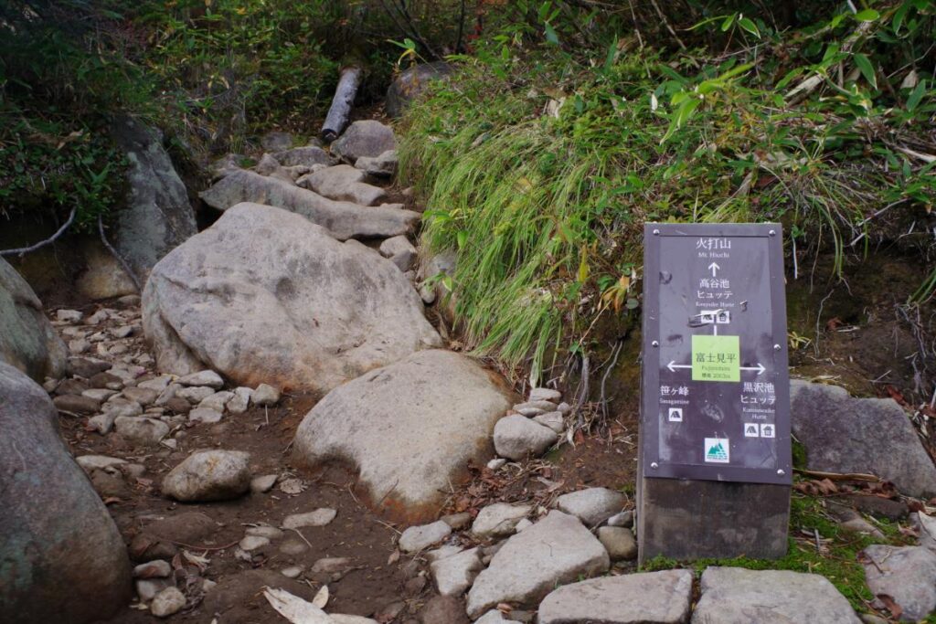 コチラでは火打山・高谷池方面と黒沢池方面への分岐となっていますが、本日は高谷池ヒュッテの方を予約してあるので、迷わずそちらの方に進んでいきます。