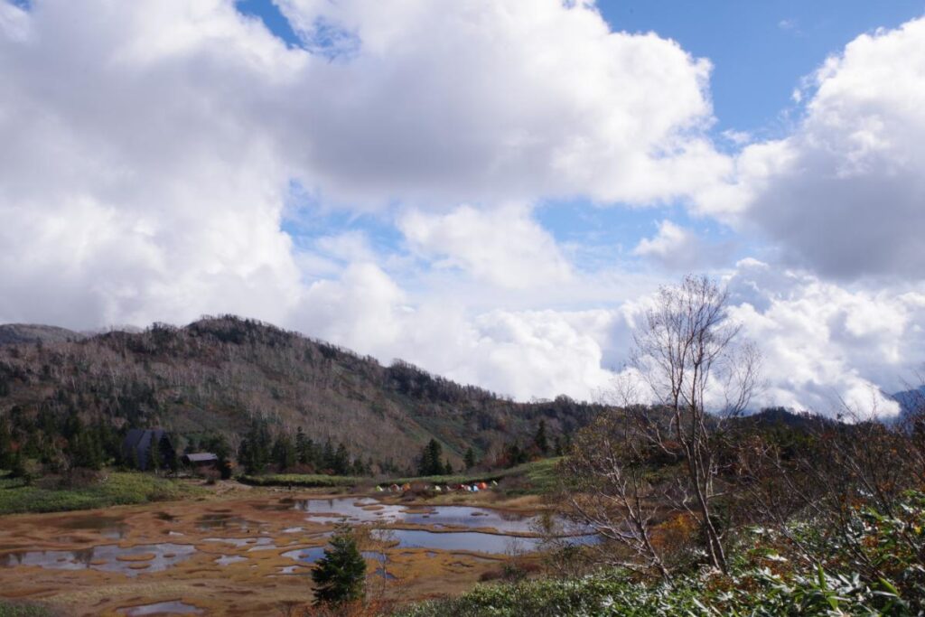 広々とした台地に点在する池塘は流れる雲を映し、三角屋根の高谷池ヒュッテが可愛く鎮座しています。
