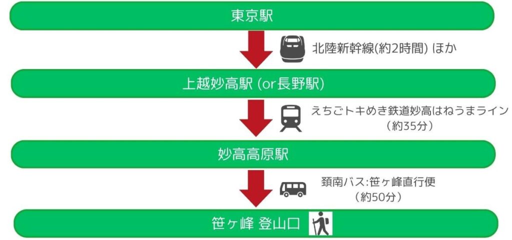 - 妙高高原駅から頚南バスの笹ヶ峰直行便に乗って笹ヶ峰下車(約50分)