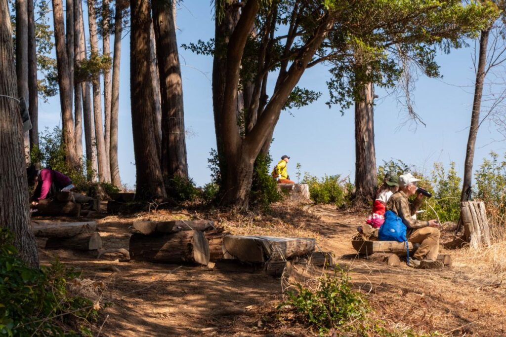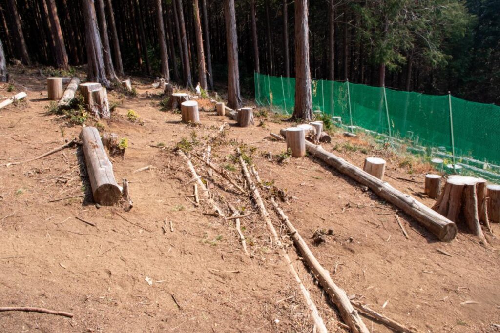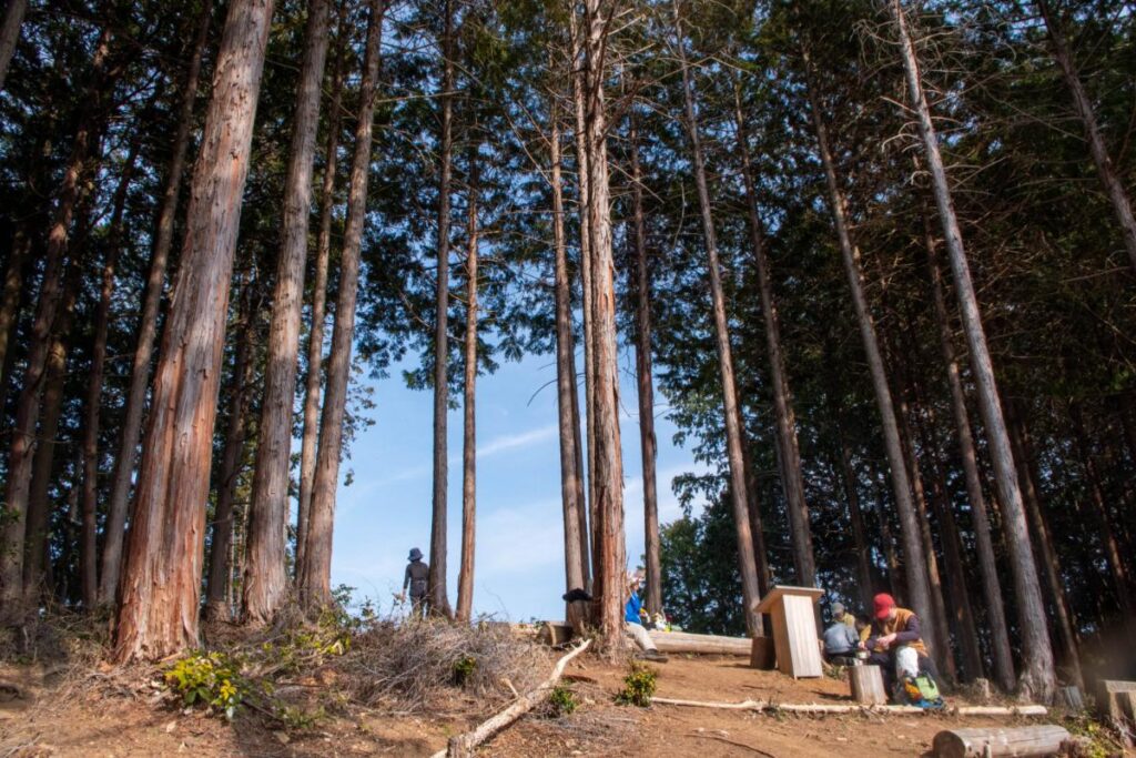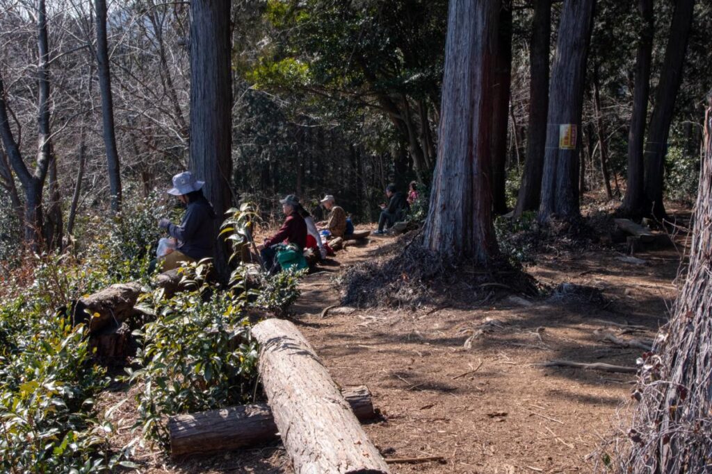 山頂については間伐された樹木がベンチ代わりにされており、休憩スペースは多めです。比較的、大人数でも安心かなという印象を受けました。
