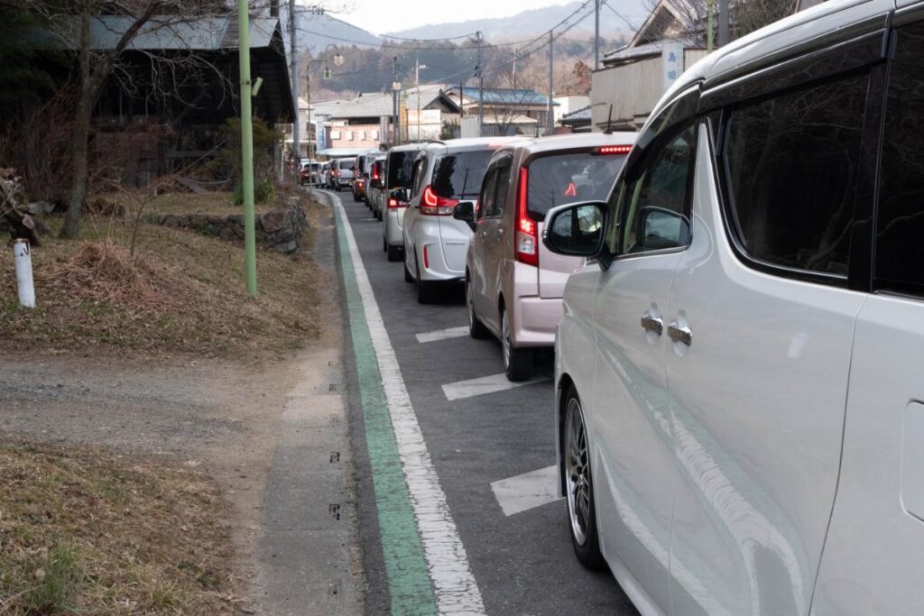 早速、梅まつりの会場までのアクセスを開始するのですが、この日は見ごろを迎えて、はじめての週末であったということで、車道では渋滞が発生中。