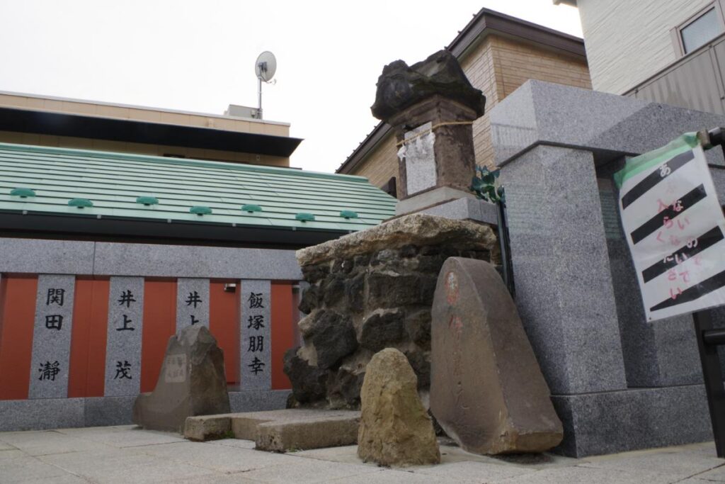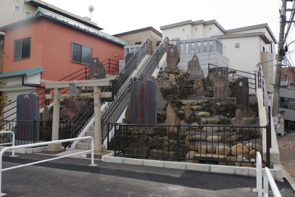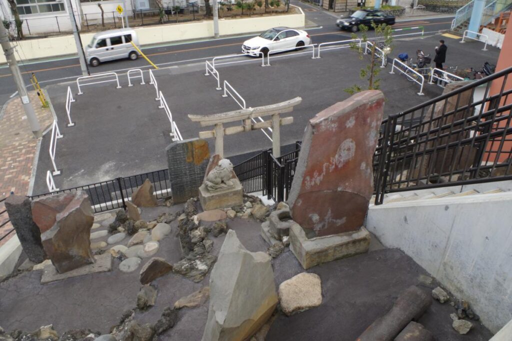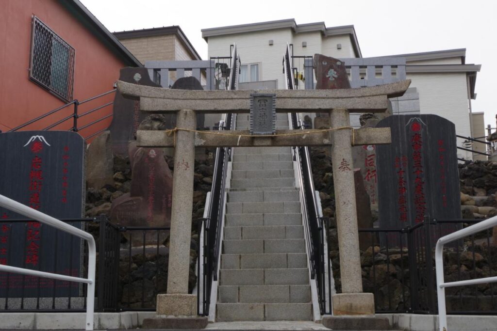 なお、前面の都道460号線の拡張工事に伴い、十条冨士塚を奥側に移設されています。この工事は2023年に完工しており、富士塚の規模は以前よりも縮小し、若干位置も変わっています。